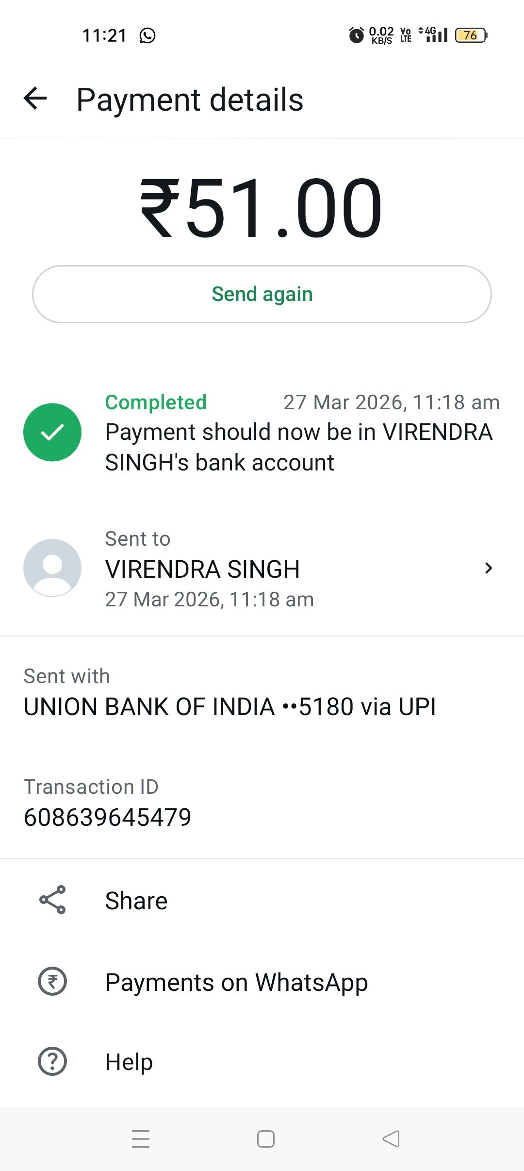 A/C Holder Name : Transaction ID : 608639645477 Teacher Mobile : 9559761587 EHRMS CODE : 29699 Amount : 51 Rs. Date : 27-03-2026