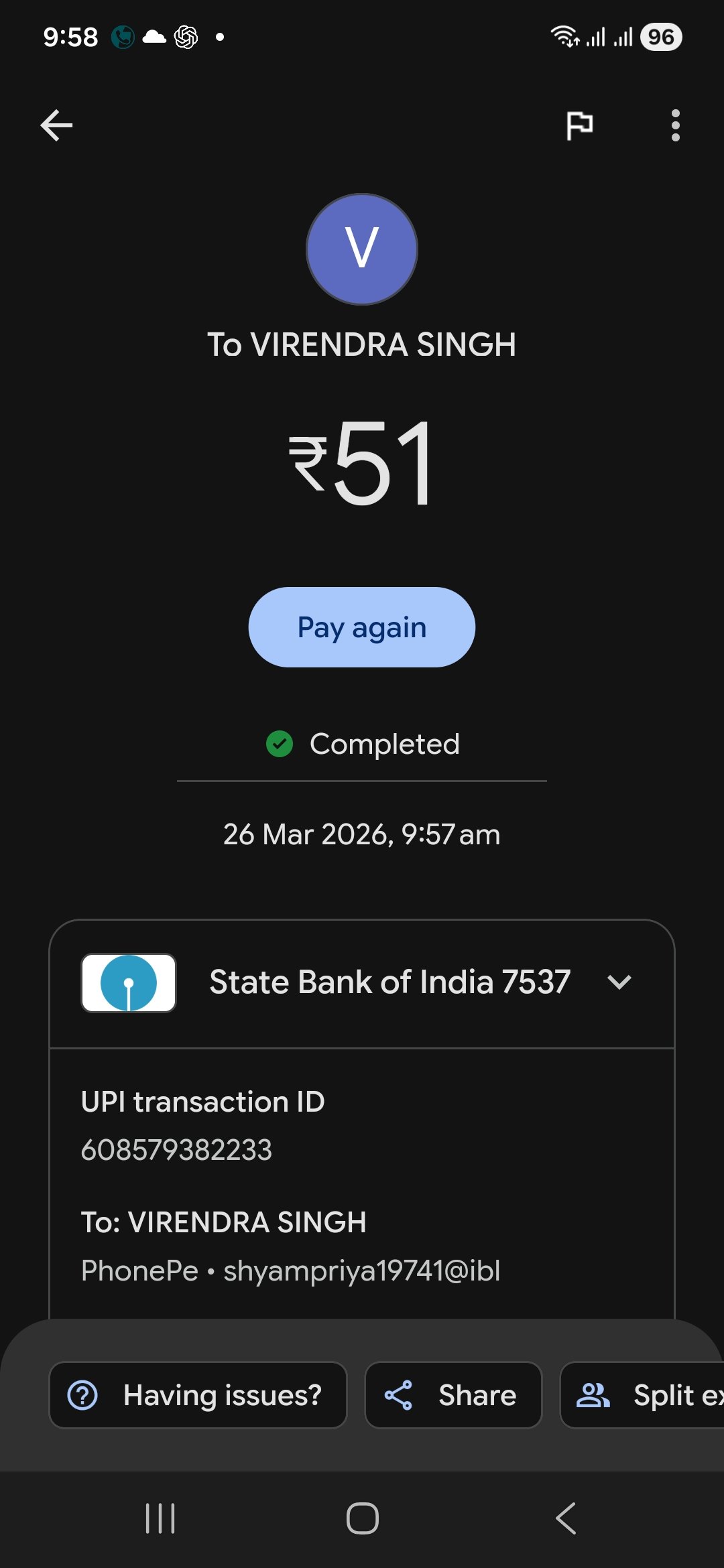 A/C Holder Name : Transaction ID : 399587668659 Teacher Mobile : 9598920042 EHRMS CODE : 3010843 Amount : 51 Rs. Date : 26-03-2026