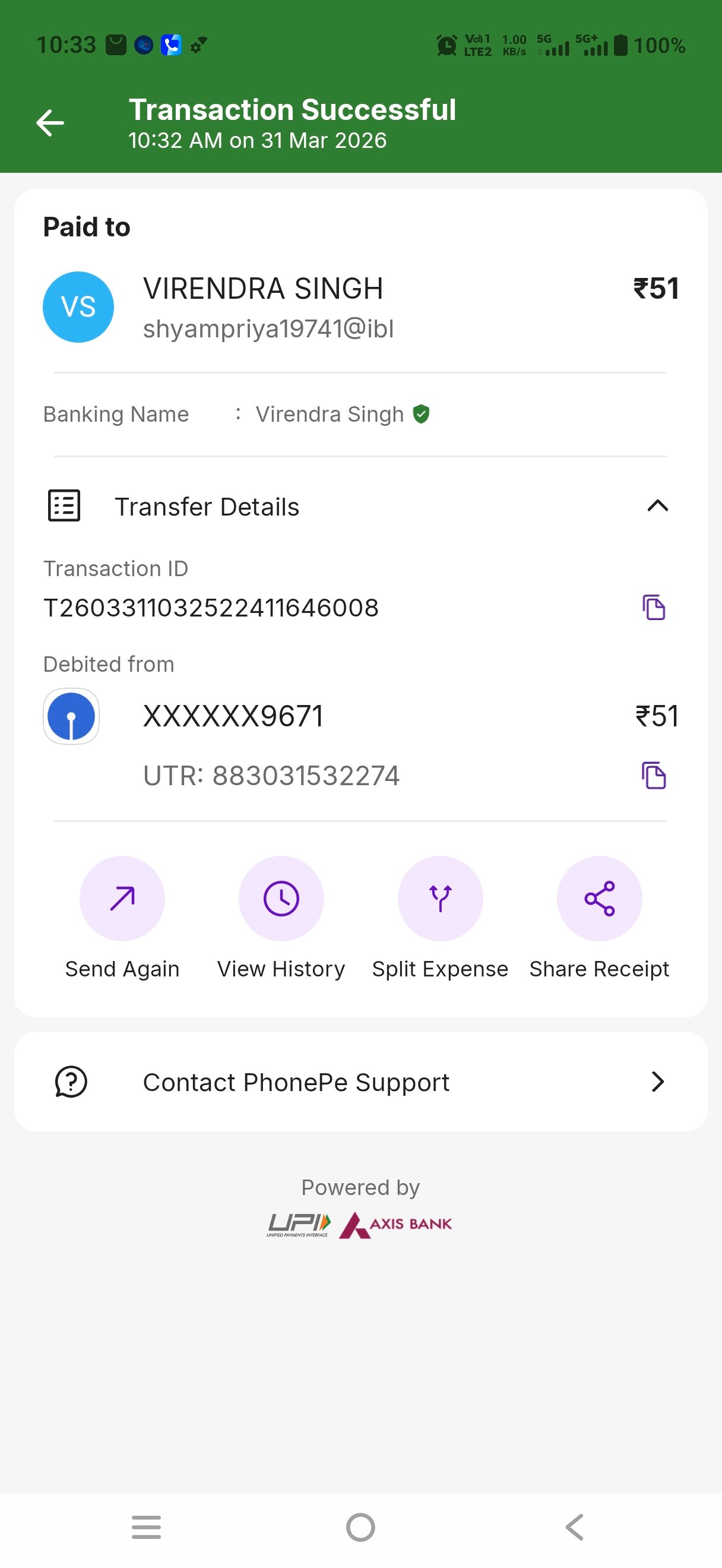 A/C Holder Name : Transaction ID : T2603311032522411646008 Teacher Mobile : 8006148388 EHRMS CODE : 1363888 Amount : 51 Rs. Date : 31-03-2026