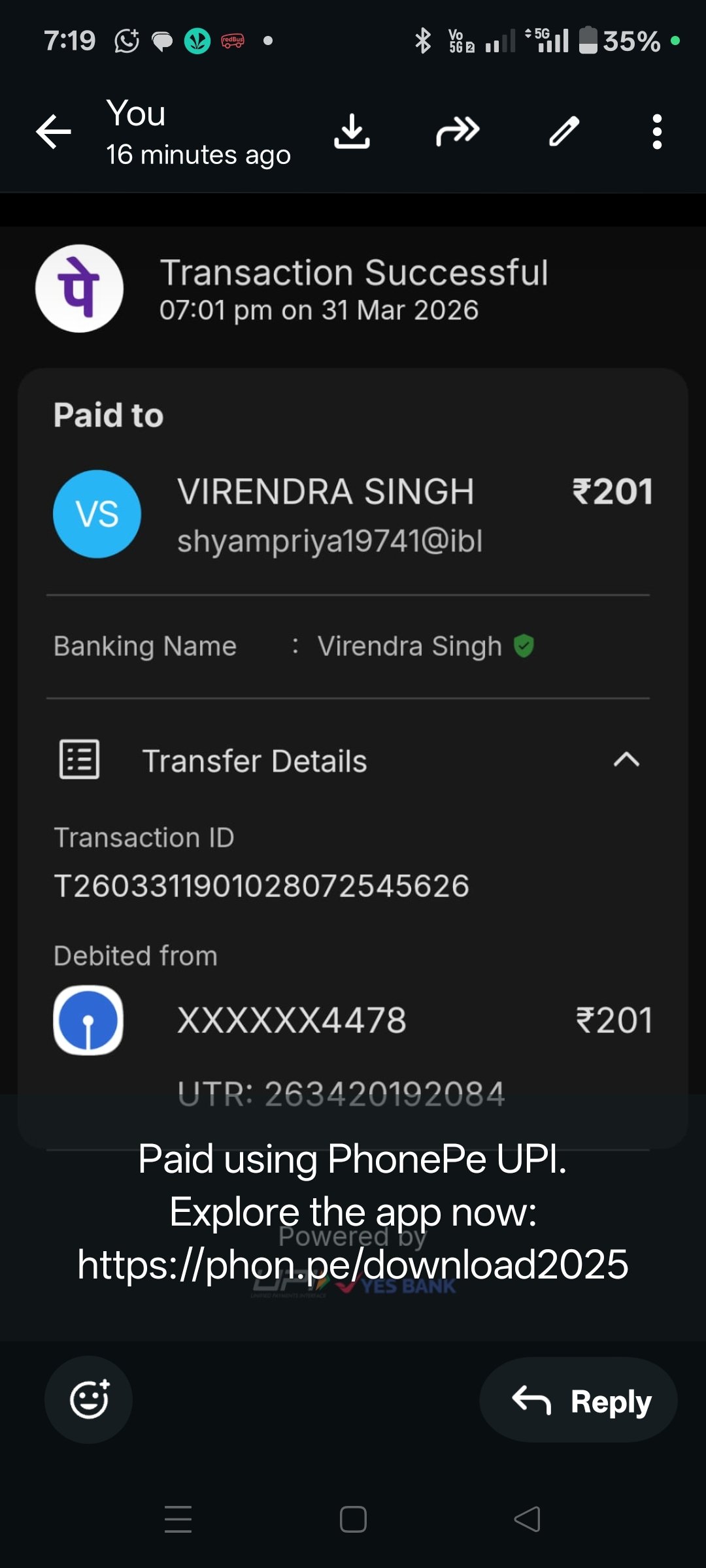 A/C Holder Name : Transaction ID : T2603311901028072545626 Teacher Mobile : 9917484078 EHRMS CODE : 174995 Amount : 201 Rs. Date : 31-03-2026